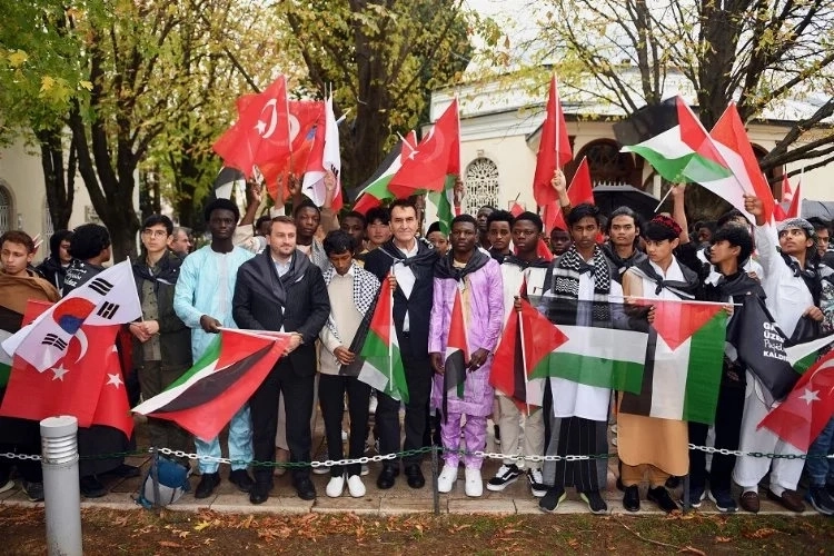 89 ülkeden 155 yabancı öğrencinin eğitim gördüğü Osmangazi Belediyesi Uluslararası Murat Hüdavendigar Anadolu İmam Hatip Lisesi öğrencileri, yöresel kıyafetleri ile birlikte Osmangazi Türbesi önünde İsrail’in Gazzeli masum ve mazlumlara yönelik katliam ve soykırımına karşı tek başına dünyaya meydan okuyan Cumhurbaşkanı Erdoğan'ın zulme karşı ümmet olma çağrısını dünyaya haykırdı.