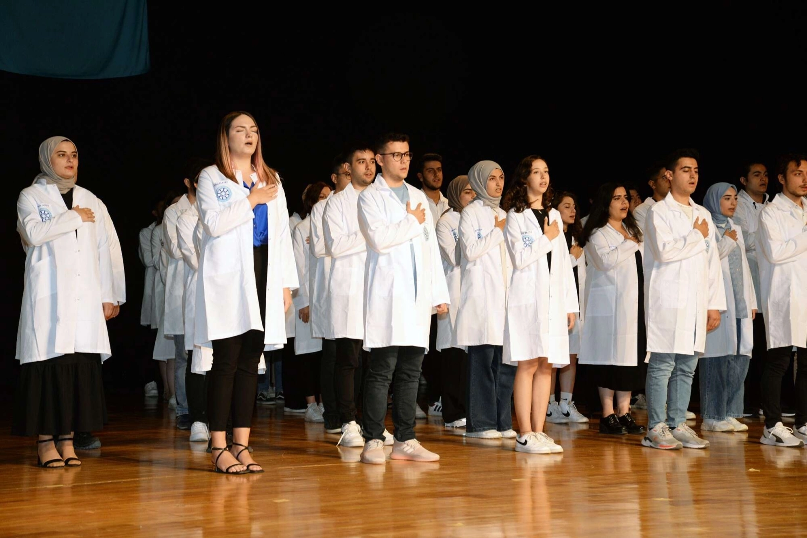 Konuşmasına fakültenin açılış süreci ve devam eden eğitim-öğretim faaliyetlerini anlatarak başlayan Dekan Prof. Dr. Halil Sağlam ise 2 yıllık yeni bir fakülte olmalarına rağmen oluşturdukları nitelikli ders modelleri sayesinde büyük mesafeler kat ettiklerini belirtti. Kuruluş aşamasında sadece Türkiye’yi değil, dünyadaki en iyi 10 diş hekimliği fakültesini de incelediklerini açıklayan Dekan Prof. Dr. Halil Sağlam; “Yaptığımız araştırmalar ve incelemeler sonucunda üniversitemize özgün bir diş hekimliği programı oluşturmayı başardık. Bu programın ana başlığı entegre eğitim modelidir. Türkiye’deki tüm tıp fakültelerinde hayata geçmiş bir programdır. Ancak diş hekimliği fakültelerinde yeni başlamaktadır. Biz bu modeli çok önemsiyoruz. Kendi fakültemizde de hassasiyetle uygulamaya gayret ediyoruz. Türkiye’deki tüm diş hekimliği fakülteleri de bu modele en kısa sürede geçecektir” şeklinde konuştu. Törene Rektör Prof. Dr. Ahmet Saim Kılavuz, Rektör Yardımcıları Prof. Dr. İrfan Kırıştıoğlu, Prof. Dr. Ferudun Yılmaz, Diş Hekimliği Fakültesi Dekanı Prof. Dr. Halil Sağlam, Tıp Fakültesi Dekanı Prof. Dr. Ekrem Kaya, Eğitim Fakültesi Dekanı Prof. Dr. Salih Çepni, Sağlık Bilimleri Fakültesi Dekanı Prof. Dr. Nurcan Özyazıcıoğlu, iş adamı İbrahim Gülmez, sivil toplum kuruluşlarının temsilcileri, akademisyenler, öğrenciler ve aileleri katıldı. Program, fakülteye katkıda bulunanlara teşekkür belgelerinin takdimi ve öğrencilere beyaz önlüklerinin giydirilmesiyle sona erdi.