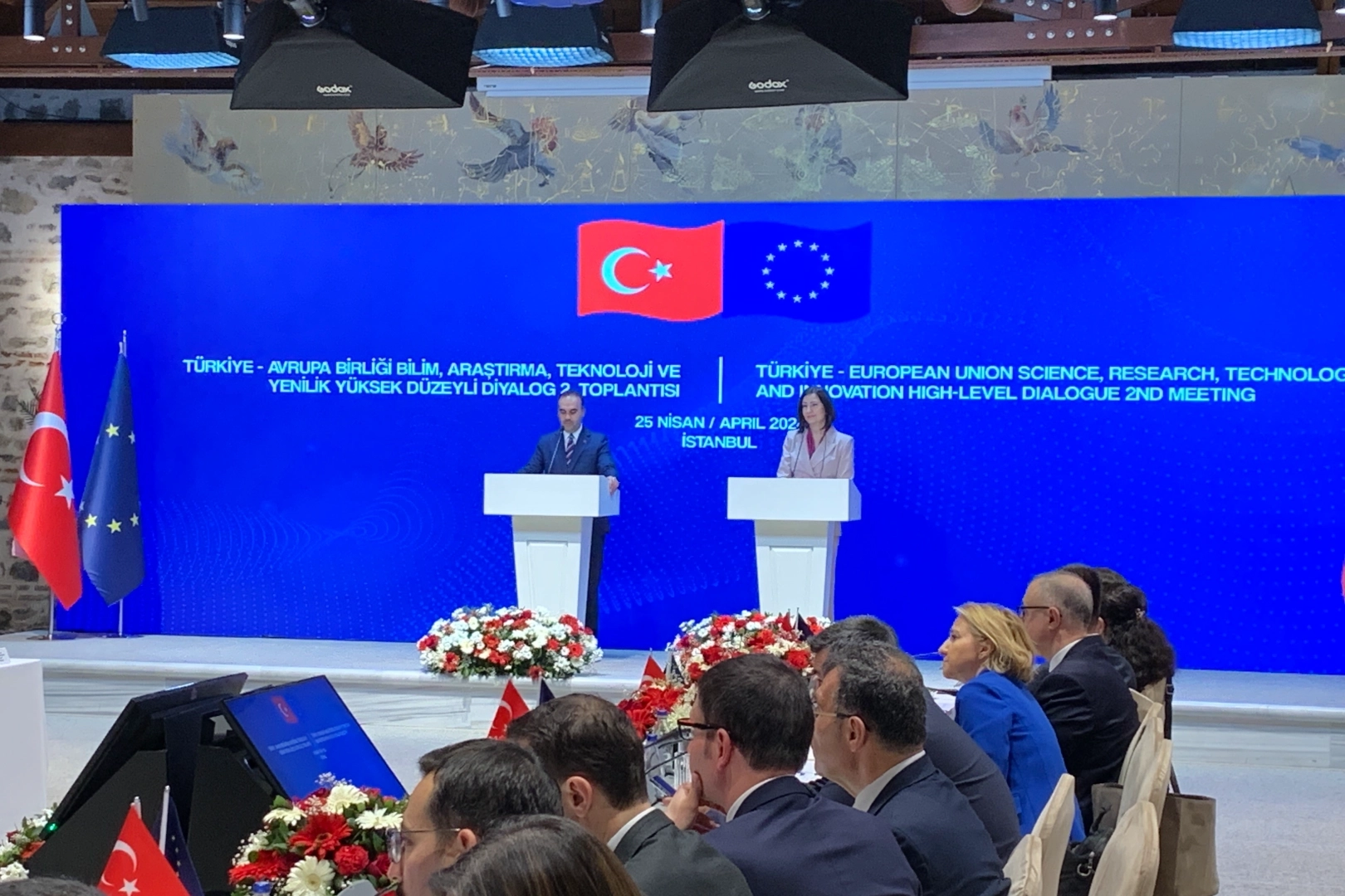 Sanayi ve Teknoloji Bakanı Mehmet Fatih Kacır ve AB Komiseri Iliana Ivanova bilim, araştırma, teknoloji ve yenilik alanında ikincisi düzenlenen Türkiye-AB Yüksek Düzeyli Diyalog Toplantısında bir araya geldi. Cumhurbaşkanlığı Dolmabahçe Çalışma Ofisi’nde düzenlenen toplantıya Türkiye ve AB tarafından çok sayıda üst düzey temsilci katıldı. Toplantı kapsamında basın açıklamasında bulunan Bakan Kacır, Türk araştırmacıların, mühendislerin ve yenilikçi firmaların diğer Avrupalılarla birlikte çalışmalarını kolaylaştırmak adına yapay engellerin kaldırılmasının elzem olduğunu belirterek, “Avrupa’nın inovasyon ve teknoloji ekosistemine dinamizm ve ivme kazandıran genç araştırmacılarımız ve girişimcilerimiz için vize muafiyetinin kritik önemi haiz olduğunu belirtmek istiyorum” ifadelerini kullandı. “AB yapılarına katılımımızın artması yönünde önemli istişarelerde bulunduk”