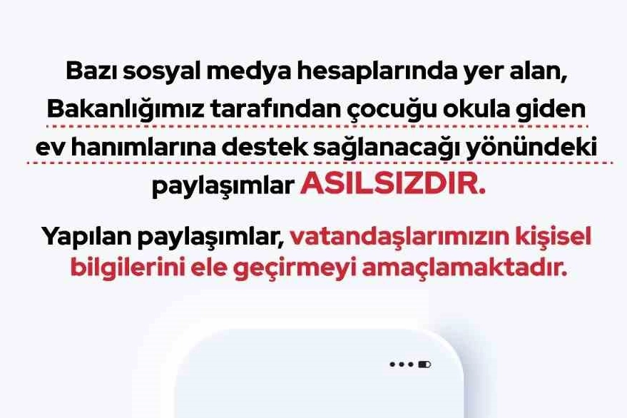 Aile ve Sosyal Hizmetler Bakanlığı, "Bazı sosyal medya hesaplarında yer alan ‘Çocuğu okula giden ev hanımlarına destek’ yönündeki paylaşımlar Bakanlığımızca değil, vatandaşlarımızın kişisel bilgilerini ele geçirmek isteyen kişilerce yapılmaktadır" açıklamasını yaptı.