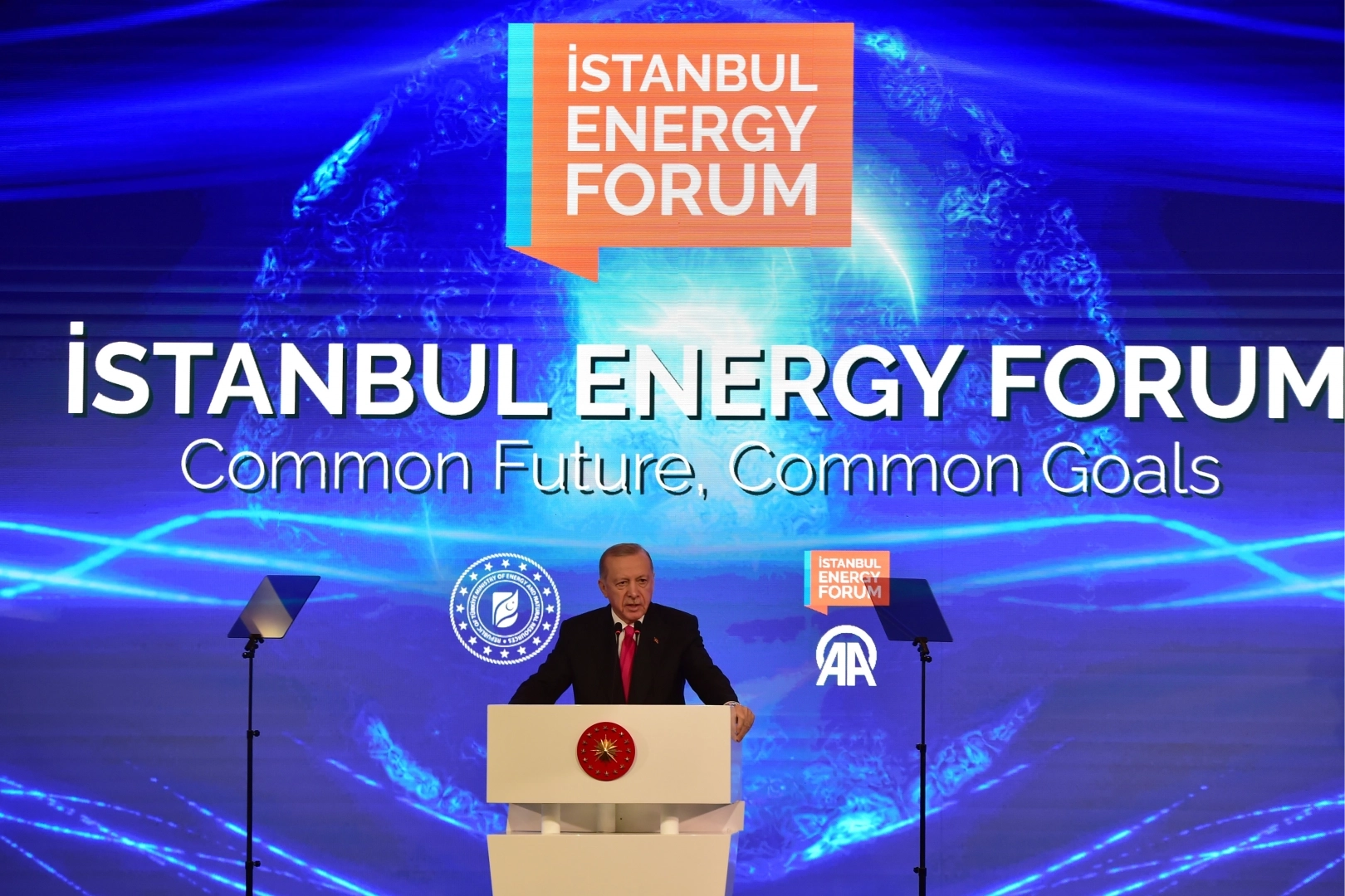 Cumhurbaşkanı Recep Tayyip Erdoğan, İstanbul Kongre Merkezi'nde düzenlenen Anadolu Ajansı İstanbul Enerji Forumu'na katıldı. "Ortak Gelecek Ortak Hedefler" temasıyla düzenlenen forumda bir konuşma yapan Cumhurbaşkanı Erdoğan, enerji, ulaştırma ve haberleşmenin özellikle birlikte kalkınmanın lokomotifi olduğunu belirterek, "Sanayileşme ve gelişmenin de temel şartı yine enerjidir. Yeterli miktarda kaliteli ve temiz enerjinin uygun fiyatlarla ve kesintisiz olarak temin edilmesi yani enerji arz güvenliği gelişmiş ve gelişmekte olan tüm ülkeler için kritik önemdedir. Yakın tarihte bölgemizde patlak veren krizler, enerji arz güvenliğinin ülke ekonomileri için ne kadar hayati olduğunu bir kez daha hatırlatmıştır. Rusya-Ukrayna arasında bininci gününü geride bırakan savaş özellikle enerji alanında dışa bağımlılığın risklerini göstermiştir. Türkiye savaşan her iki tarafla kurduğu dengeli ilişkiler sayesinde bu sancılı dönemi en rahat atlatan ülkelerden biri olmuştur. Avrupalı dostlarımız savaşın tetiklediği enerji krizini ilk elden hissettiler ve çok ciddi sıkıntılarla karşılaştılar. Şunu bir defa görmemiz gerektiğine inanıyorum. Her ne kadar günümüzde enerji arzında bir kriz yaşanmıyorsa da enerji arz güvenliğinin temini noktasında her zaman hazırlıklı olmak gereklidir. Biz de bu anlayışla enerji politikamızı çocuklarımızın çocuklarımızın emaneti olan tabiata zarar vermeden enerji arz güvenliğimizin sağlanması üzerine bina ettik. Enerjide sürdürülebilirliğin sağlanmasına, dışa bağımlılığın azaltılmasına, enerji maliyetlerimizin hafifletilmesine önem veriyoruz. Çünkü biz, etrafımızdaki birçok ülkenin aksine kullandığı enerjinin çoğunu dışarıdan satın almak mecburiyetinde olan bir ülkeyiz" dedi.