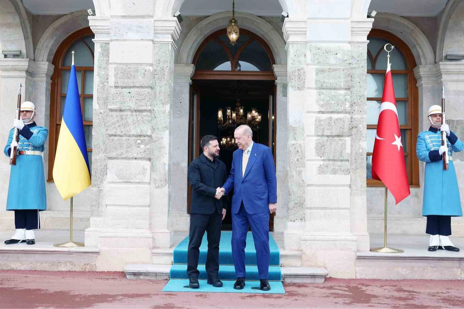 Cumhurbaşkanı Recep Tayyip Erdoğan, Ukrayna Devlet Başkanı Vladimir Zelenskiy’i resmi törenle karşıladı. Cumhurbaşkanlığı Dolmabahçe Çalışma Ofisi’ndeki resmi karşılama töreninin ardından Cumhurbaşkanı Erdoğan ile Ukrayna Devlet Başkanı Zelenskiy, ikili görüşmeye geçti. Görüşmede İstanbul süreci, ateşkesin tesisi ve kalıcı çözümün ele alınacağı öğrenildi.
