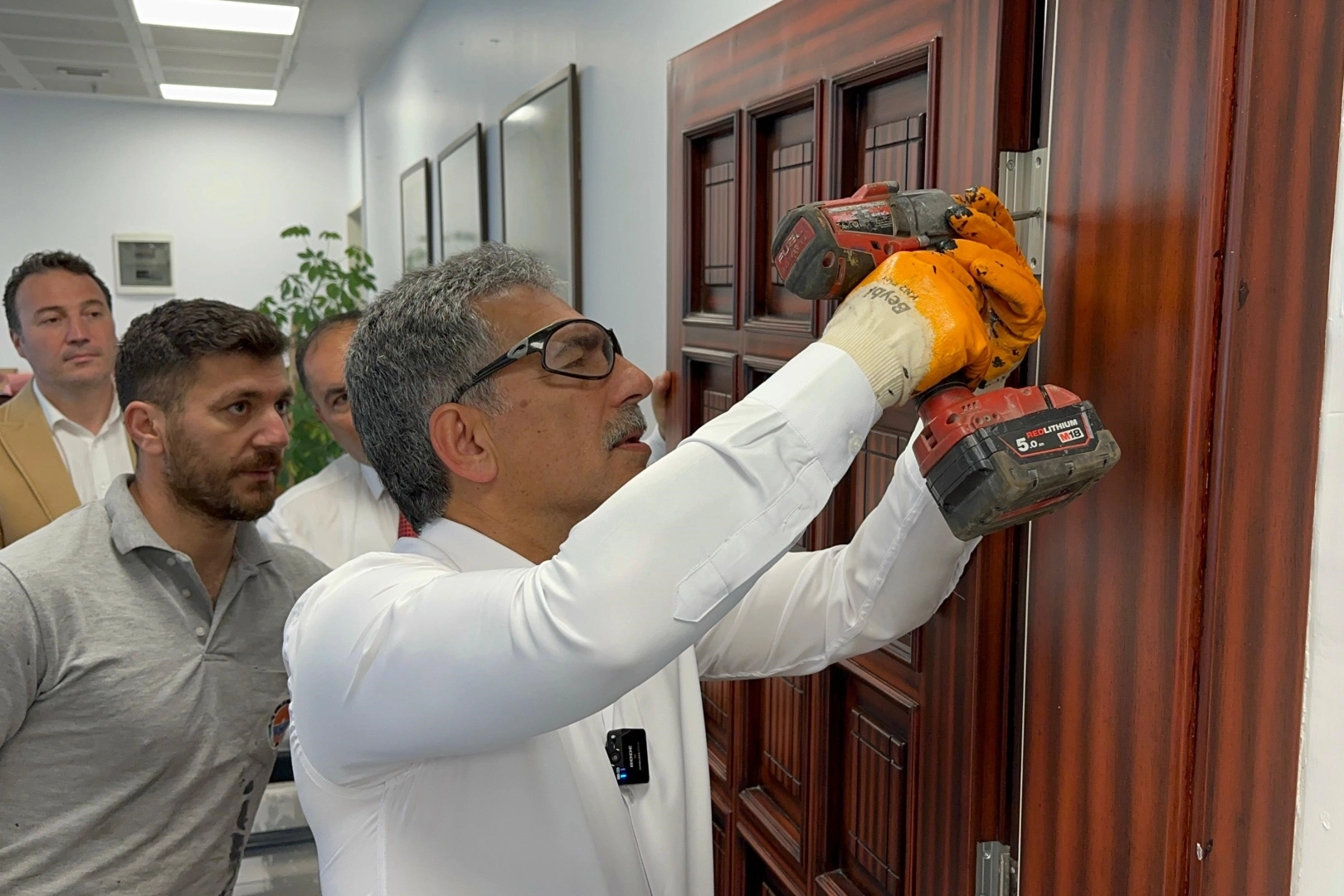Konuşmasının ardından iş güvenliğinin önemine de vurgu yapan Deviren, makam kapısını kendi elleriyle söktü.