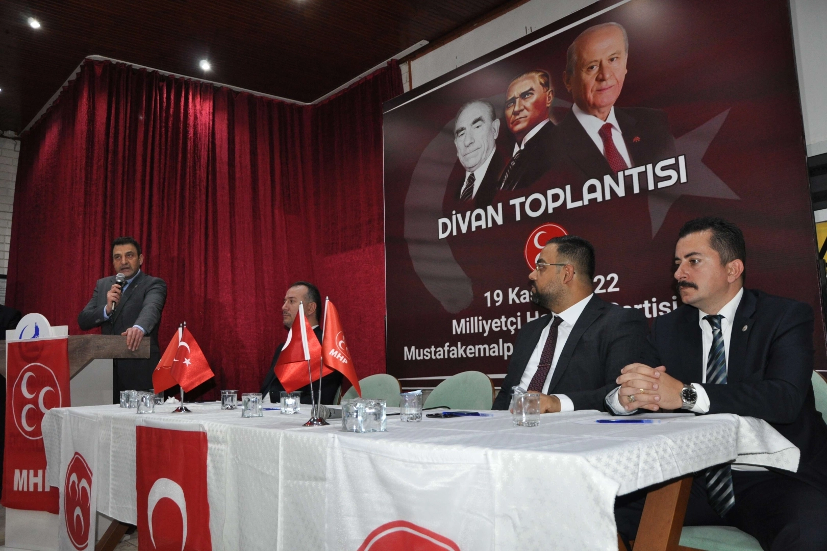 Öğretmenevi’nde gerçekleştirilen toplantıya; MHP Merkez Disiplin Kurulu Üyesi Muhammet Tekin, MHP Bursa Başkanı Cihangir Kalkancı, MHP Bursa Başkan Yardımcıları Ahmet Doğu, Mehmet Yıldız ve Musa Yılmaz, MHP Bursa Kadın Kolları Başkanı Filiz Dağhan Duzcu, MHP Mustafakemalpaşa İlçe Başkanı Ahmet Beygirci, yöneticiler ve çok sayıda partili katıldı. Mustafakemalpaşa Belediye Başkanı Mehmet Kanar, AK Parti Başkanı Murat Hallaçoğlu, AK Parti Kadın Kolları Başkanı Güler Akgöz ve bir grup AK Partili heyetinde katılım gösterdiği MHP Divan Toplantısı, saygı duruşu ve İstiklal Marşı ile başladı.
