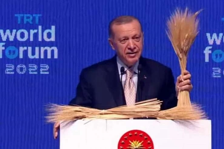 Savaş dolayısıyla Ukrayna ve Rusya'dan tahıl başta olmak üzere kritik ürünlerin sevkiyatının durması Avrupa'dan Afrika'ya tüm ülkeleri etkileyen küresel çapta bir gıda krizine sebep olduğuna vurgu yapan Cumhurbaşkanı Erdoğan, "İşte her şey burada. Buğday olmadan ekmek olur mu? Ama unutmayalım ki şu buğdayın tanesinde çok şeyler var. Bir buğday tanesi yüz binlerce buğdayın ne yapıyor üretiyor. Buğday o denli farklı bir nimet. Bu krizi çözmek amacıyla pazar günü inşallah Sayın Putin ile görüşmem olacak. Aynı şekilde Sayın Zelenskiy ile görüşmem olacak. Bu görüşmelerle birlikte istiyoruz ki bu tahıl koridorunu daha da güçlendirelim ve Sayın Putin'in de ifadesiyle öncelikle az gelişmiş ülkelere bu tahıl koridorundan tahıl ambarından bu imkanları gönderelim. Tahıl koridorundaki tıkanıklığın aşılması ve sonrasında anlaşmanın süresinin uzatılması yine ülkemizin girişimleri sayesinde mümkün olabildi" diye konuştu.