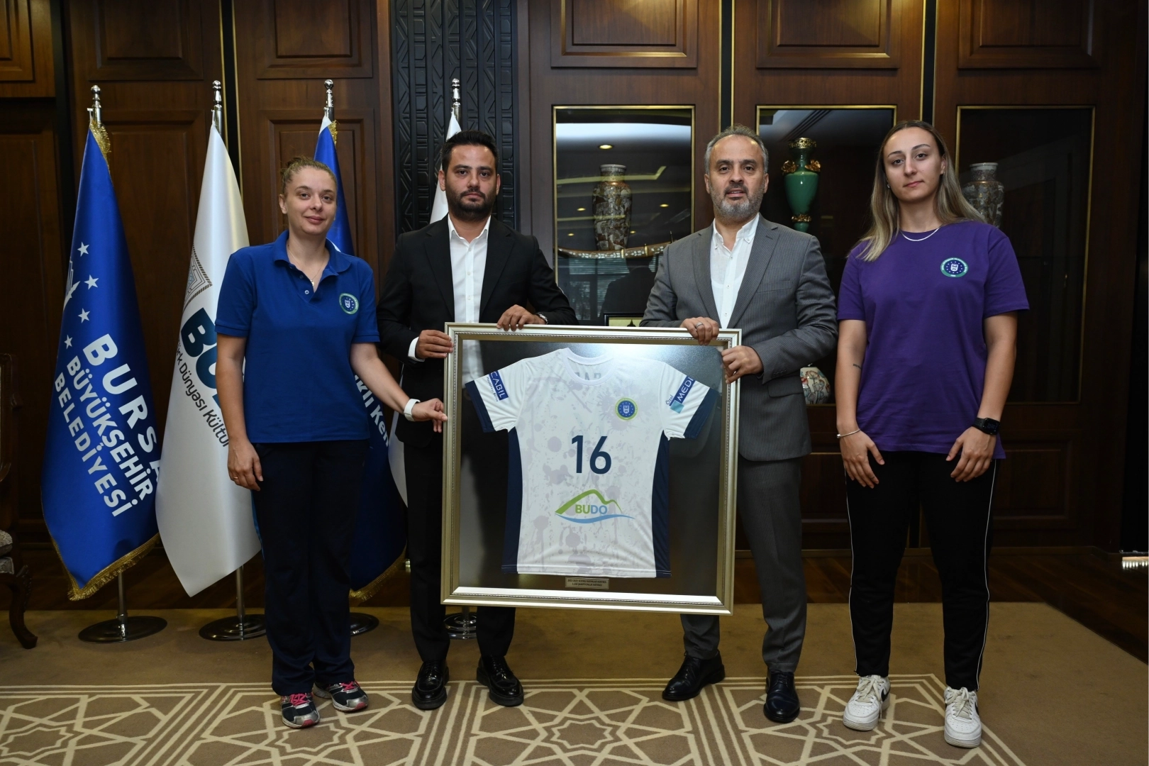 Yaklaşık 10 yıl önce Mudanya’da ilkokul 4. sınıftayken Antrenör Merve Yılmaz tarafından okullardan seçilerek hentbolla tanışan ve kısa zamanda ayakta alkışlanacak bir başarı hikâyesine imza atan Poyrazın Kızları, son 2 yıldır Bursa Büyükşehir Belediyespor Kulübü’nün formasını terletiyor. Büyükşehir çatısı altındaki henüz ikinci yıllarında Türkiye Şampiyonluğunu Mudanya’ya kazandıran sporcular, ayrıca okul sporlarında 4 Türkiye Şampiyonluğu elde ederek yakalanması güç bir başarıya da imza attılar. 26 Ağustos’ta başlayacak Süper Lig’e, biri Sırp, biri Karadağlı iki yabancı oyuncu transferiyle iddialı bir şekilde hazırlanan Poyrazın Kızları, sezon öncesi Büyükşehir Belediye Başkanı Alinur Aktaş’ı ziyaret etti. Ziyarette Antrenör Merve Yılmaz ile Büyükşehir Belediyespor Kulübü Başkanı Gökhan Dinçer’in de katıldığı ziyarette sporcularla sohbet eden Başkan Aktaş, yeni sezon için başarı dileğinde bulundu.