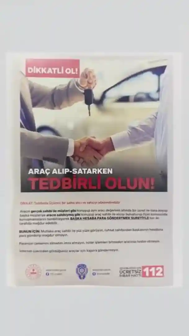"Çok ucuza buldum demeyin, sazan sarmalı oyununa gelmeyin. Araç satış işlemleri boyunca ruhsatın asıl sahibi haricinde hiçbir kişiyle görüşmeyiniz. Noterdeki araç devri esnasında aracın ücretini arkadaş, akraba ve kuzen olarak tanıtılan üçüncü kişilere göndermeniz isteniyorsa dolandırılıyor olabilirsiniz. Dikkatli olalım ve birikimlerimizi dolandırıcılara kaptırmayalım."