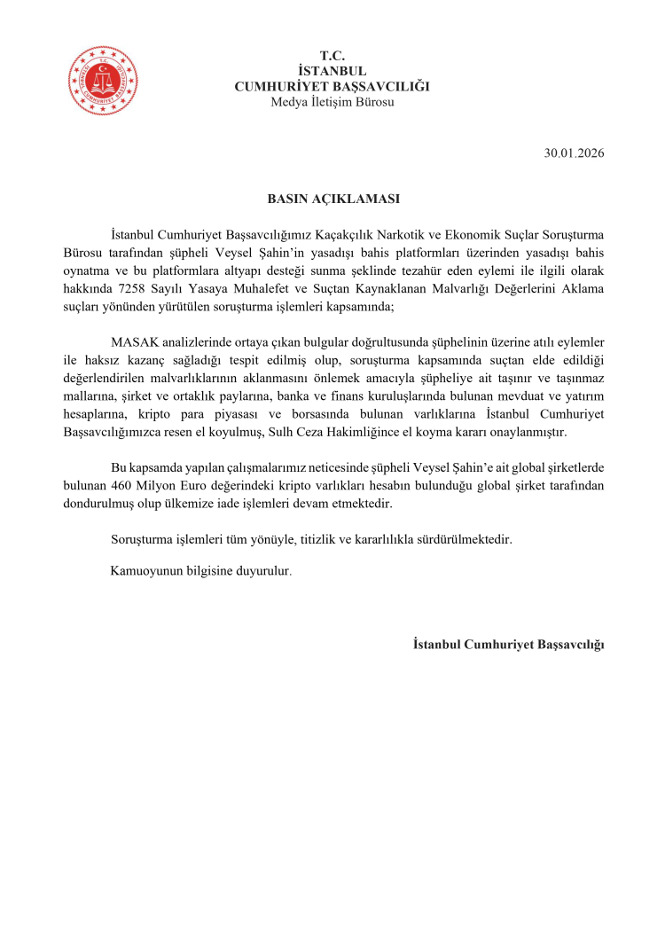 İstanbul'da yasadışı bahis soruşturmasında, 'bahis baronu' olark bilinen Veysel Şahin'in yasadışı bahis oynattığı ve kara para akladığı belirlenerek, şüphelinin mal varlıklarına el konuldu. 460 milyon Euro değerindeki kripto varlıkları ise donduruldu. Soruşturma sürüyor.