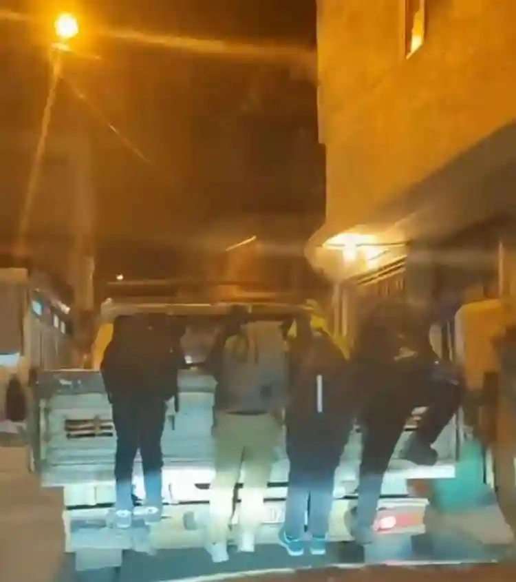 Bursa’da açık kasa bir kamyonetin arkasına asılarak yolculuk yapan çocukların tehlikeli yolculuğu kameraya yansıdı.