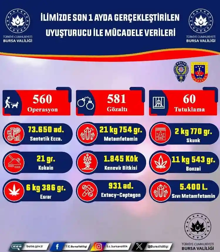 Bursa'da son bir ayda İl Emniyet Müdürlüğü ve Jandarma Komutanlığı'na bağlı ekiplerin düzenledikleri 560 operasyonda gözaltına alınan 581 şüpheliden 60 kişinin tutuklandığı kaydedildi.