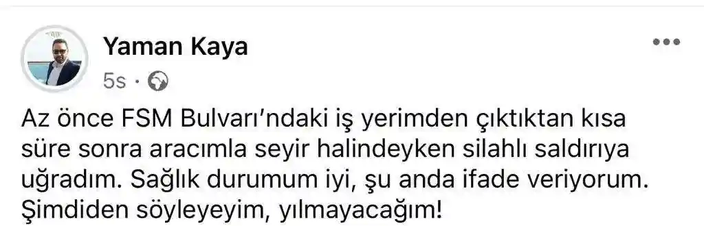 Yaşadığı olayın ardından sosyal medya hesabından yaptığı açıklamada Yaman Kaya, “Az önce (FSM) Bulvarı’ndaki iş yerimden çıktıktan kısa süre sonra aracımla seyir halindeyken silahlı saldırıya uğradım. Sağlık durumum iyi, şu anda ifade veriyorum. Şimdiden söyleyeyim, yılmayacağım” ifadelerine yer verdi.