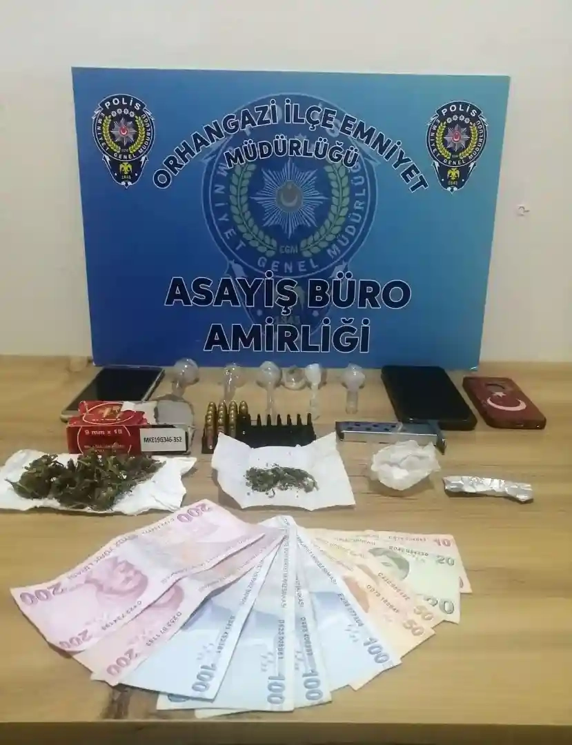 Orhangazi Emniyet Müdürlüğü asayiş büro ekipleri uyuşturucu ticareti ile ilgili yaptığı çalışma doğrultusunda M.T. isimli şahsın üst aramasında üzerinde bir miktar uyuşturucu ele geçirdi. Şahsın yapılan sorgusunda uyuşturucuyu A.K. isimli şahıstan temin ettiğini belirtmesi üzerine A.K. Cumhuriyet Savcısının talimatı doğrultusunda gözaltına aldı. Şahsın ikametinde yapılan aramada ise yasaklı maddeler ile uyuşturucu kullanımına yarayan cam aparatlar ele geçirildi. Emniyet Müdürlüğündeki ifadesinin ardından A.K. Orhangazi Adliyesinde mahkemeye sevk edildi.