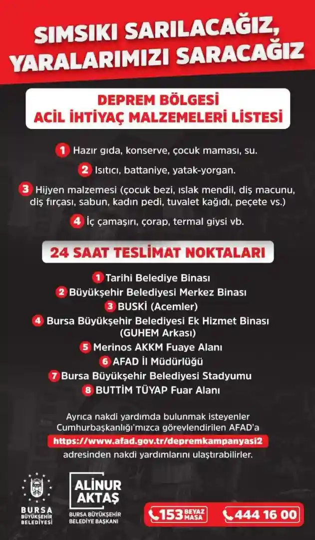 Deprem bölgesinde acil ihtiyaç duyulan malzemelerin temini için başlatılan yardım kampanyasına Bursalılar gönülden destek verdi. Büyükşehir Belediyesi tarafından belirlenen yardım toplama merkezleri sabaha kadar vatandaşların akınına uğradı.