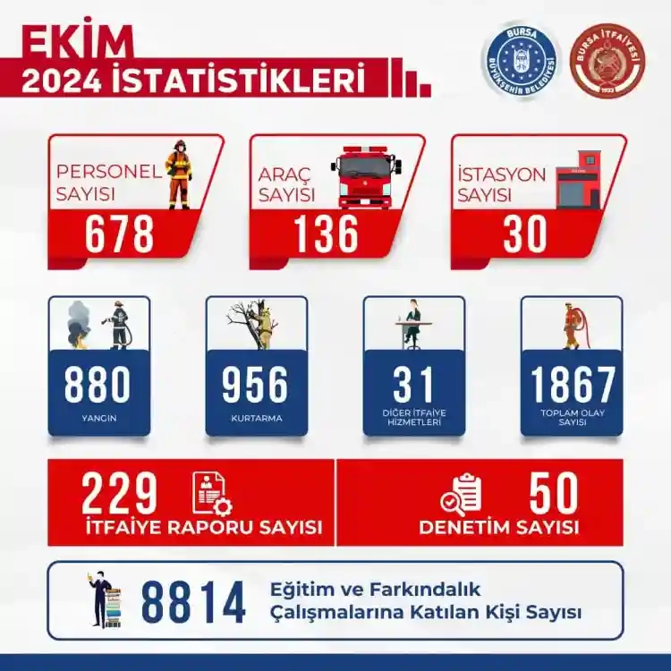 Bursa Büyükşehir Belediyesi İtfaiye Daire Başkanlığı'ndan yapılan açıklamada ekipler Ekim ayında 880 yangın, 956 kurtarma ve 31 diğer itfaiye hizmetleri olmak üzere bin 867 olaya müdahale etti.