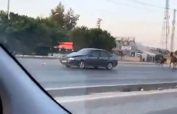 Bursa'da 11 Eylül Bulvarı, yakın çevre yolunda sahipsiz şekilde başıboş gezen atlar trafiği birbirine kattı. Ters şeritten dört nala koşan atlar, karşı yönden gelen araca çarptı. Sürücü ne olduğunu anlamadan aracın ön tarafı dağıldı. Yaşanan korku dolu anlar ise, saniye saniye bir vatandaş tarafından kaydedildi.