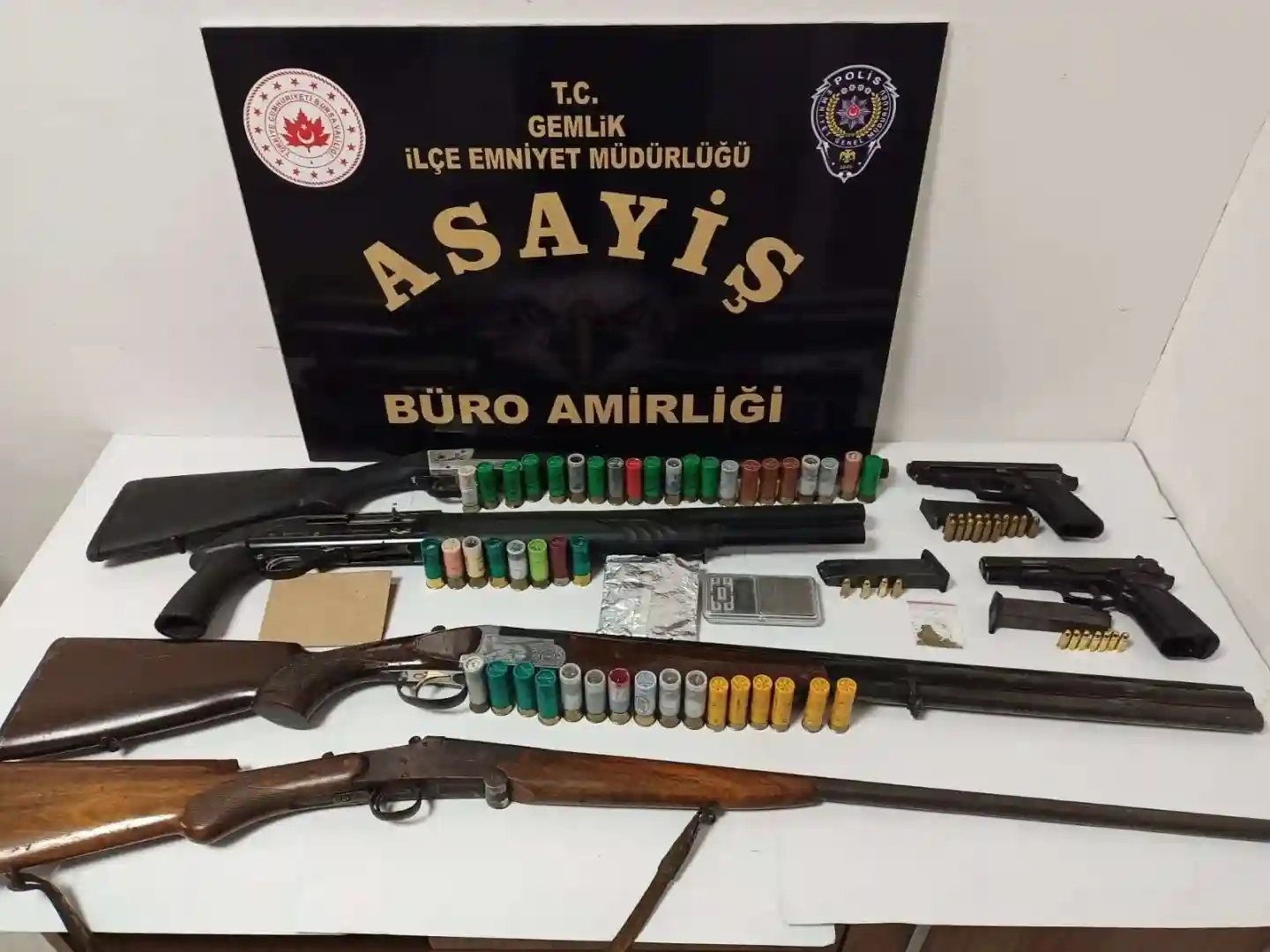 Gemlik Cumhuriyet Başsavcılığının koordinesinde, Gemlik İlçe Emniyet Müdürlüğü ekiplerinin yaptığı istihbarat çalışmaları sonucunda tespit edilen 7 adrese eş zamanlı operasyon düzenledi. Operasyon düzenlenen evlerde yapılan aramalarda; 4 adet tüfek, 40 adet av tüfeği fişeği, 2 adet ruhsatsız tabanca, 27 adet fişek, hassas terazi, esrar ve metamfetamin ele geçirildi. Operasyon sonrası 5 şüpheli gözaltına alınarak Gemlik İlçe Emniyet Müdürlüğüne getirildi.