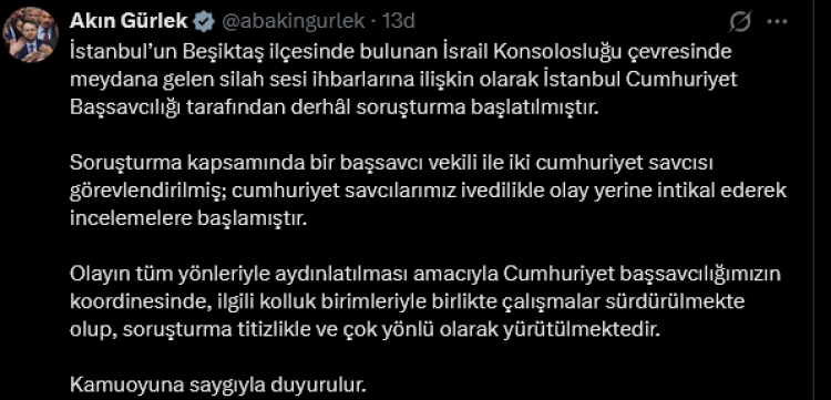 İsrail Konsolosluğu çevresinde meydana gelen silah sesi ihbarları sonrası, Adalet Bakanı Akın Gürlek açıklama yaptı.