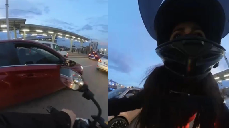 Olay anını anlatan motosiklet sürücüsü Rabia Bozkurt, "Trafikte seyir halindeyken orta şeritte seyrediyordum. Arkamda bir aracın beni sıkıştırdığını fark ettim. Motosikletin boyutu nedeniyle küçük olduğu için araç gibi şeritte yer kaplamıyor. Arkamda bulunan kadın da beni sıkıştırdı. Ben sağa çekildikçe o üzerime doğru geldi. Daha sonra inatlaşınca bana çarptı ve bende dengemi kaybettim. Zor olsada denge mi toparladım ve motosikletten inerek tepki gösterdim. Bu tür olayların yaşanmaması lazım" dedi.