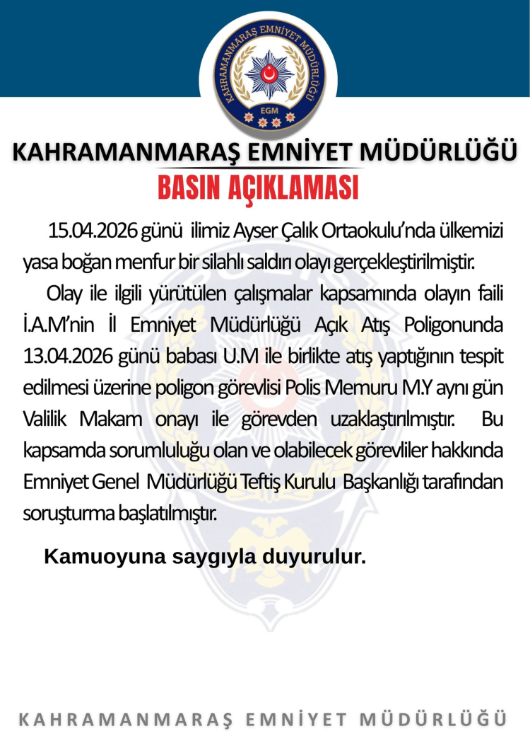 Kahramanmaraş'ta Ayser Çalık Ortaokulu’ndaki silahlı saldırının faili İ.A.M’nin olaydan iki gün önce babasıyla emniyet poligonunda atış yaptığı belirlendi. Soruşturma genişletildi, poligon görevlisi polis memuru M.Y. görevden uzaklaştırıldı.