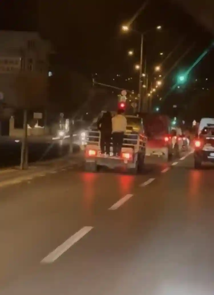 Olay, 35'lik yol üzerinde meydana geldi. Seyir halindeki kamyonetin arkasına asılan duyarsız gençlerin tehlikeli yolculuğu, vatandaşların cep telefonu kamerasına saniye saniye yansıdı.