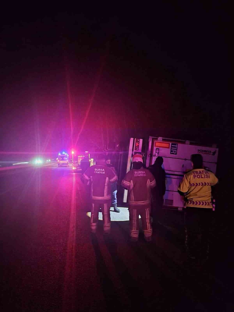 Kaza saat 05.30 sıralarında Bursa-Ankara karayolu üzeri İnegöl’ün Mezit-5 mevkiinde meydana geldi. Bozüyük istikametinden İnegöl’e seyir halinde olan Sürücü Saffet S.(33) yönetimindeki 35 CYB 918 plakalı patates yüklü TIR, sürücüsünün kontrolünden çıkarak yolun kenarına devrildi. Kaza yerine 112 jandarma ve itfaiye arama kurtarma ekipleri sevk edildi. Ekipler kabinde mahsur kalan sürücüyü kurtardılar. Kazayı burnu bile kanamadan atlatan şoför, hastaneyi gitmeyi reddedince Ambulansta tedavi edildi.