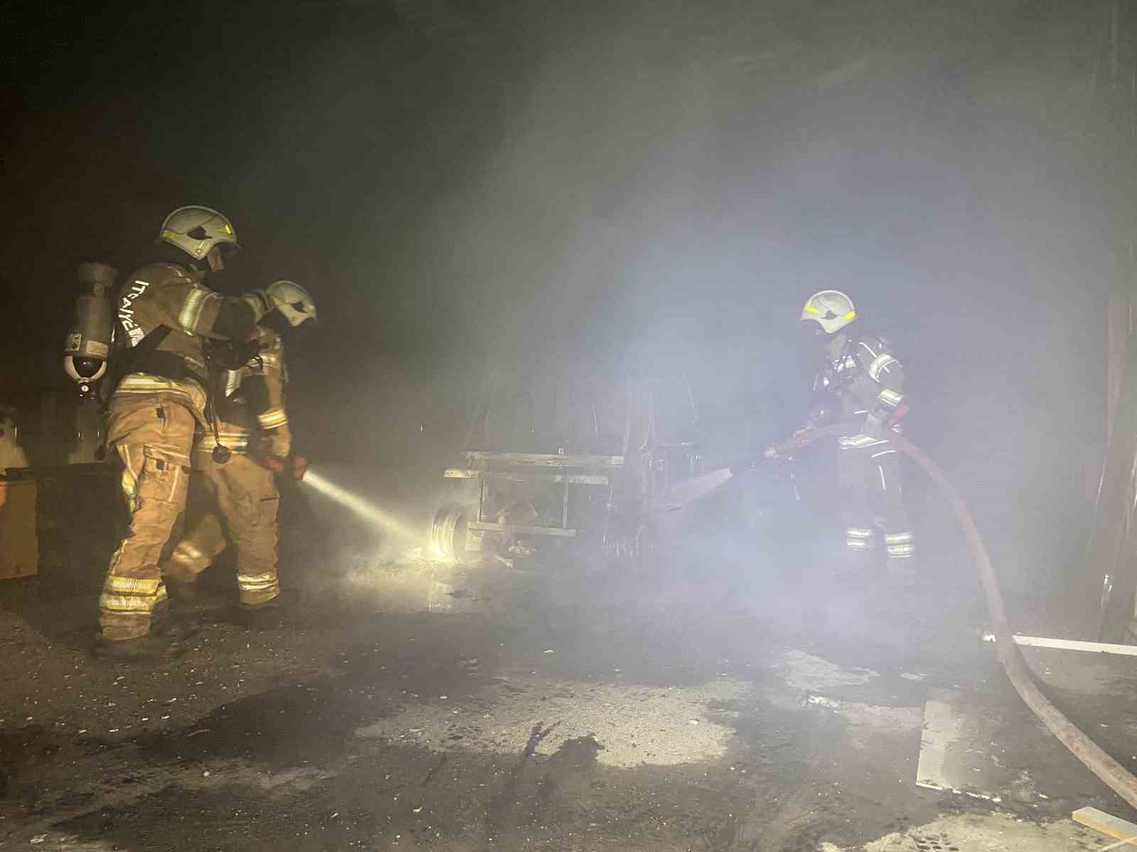 Edinilen bilgilere göre olay, saat 23.45 sıralarında meydana geldi. Atölye içerisinde bulunan elektrikli araç ve benzinle çalışan ATV motoru, henüz bilinmeyen bir nedenle alev aldı. Elektrikli araçtaki lityum bataryanın etkisiyle alevler kısa sürede yükselirken, benzinli ATV motorunda meydana gelen patlama çevrede paniğe neden oldu.