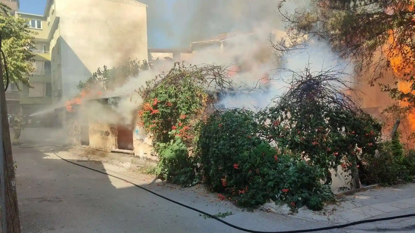 Yangın, Bursa'nın Orhangazi ilçesi Fevzi Efendi Caddesi üzerinde boş bulunan bahçeli müstakil evde çıktı. Dumanların yükseldiğini gören vatandaşlar, itfaiye ekiplerine bildirdi. Bahçedeki ağaçların da tutuşmasıyla, müstakil ev alev topuna döndü.