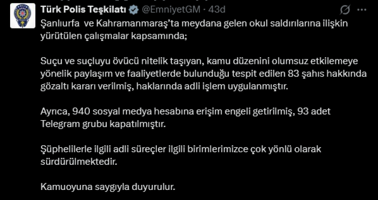 Emniyet Genel Müdürlüğü, Şanlıurfa ve Kahramanmaraş’taki okul saldırılarına ilişkin yürütülen çalışmalar kapsamında suçu öven paylaşımlara yönelik geniş çaplı işlem başlattı. 940 sosyal medya hesabına engel getirilirken, 93 Telegram grubu da kapatıldı.