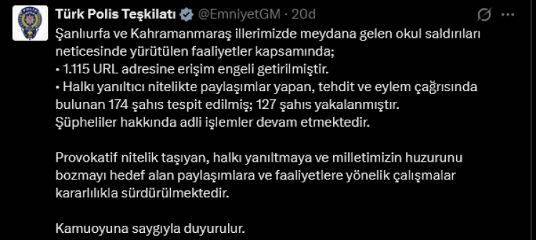Emniyet Genel Müdürlüğü, saldırıların ardından yürütülen çalışmalar kapsamında 1.115 internet adresine erişim engeli getirildiğini, provokatif paylaşımlar yapan 174 kişiden 127’sinin yakalandığını açıkladı.