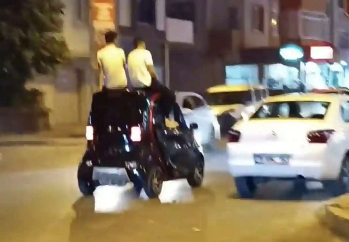 Olay, dün akşam saatlerinde İnegöl'ün Kemalpaşa Mahallesi Adnan Menderes Bulvarı üzerinde meydana geldi. 2 genç, elektrikli aracın üzerine oturarak dakikalarca seyrettiler. O anlar amatör kameraya yansırken, gören sürücüler şoke oldu.