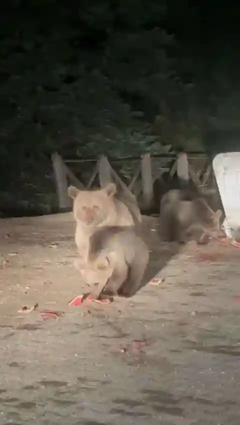 Uludağ’da karnı acıkan ayı ailesi çöp konteynerlerini karıştırıp yiyecek aradı. Ayıların karpuz yediği anlar bir vatandaş tarafından kayıt altına alındı.