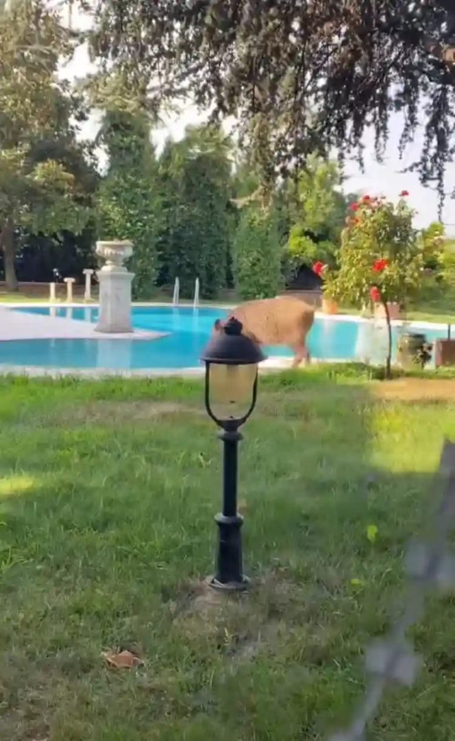 Villaya kaçak giren domuz havuza böyle düştü