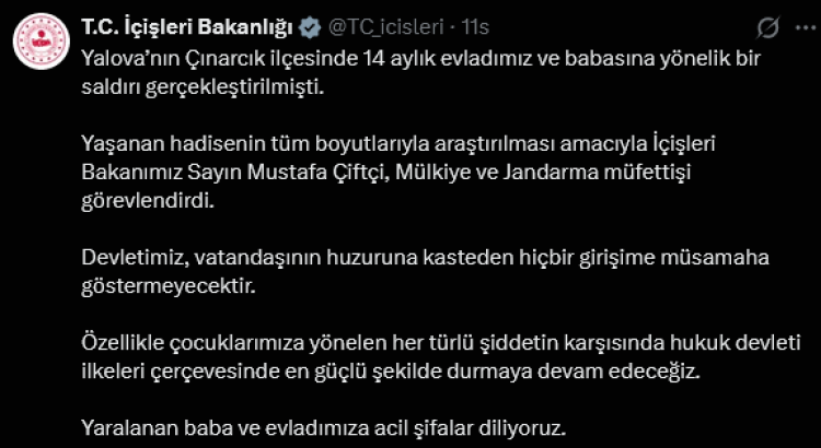 İçişleri Bakanlığı, Yalova’nın Çınarcık ilçesinde 14 aylık bir çocuk ve babasına yönelik saldırının tüm yönleriyle araştırılması için mülkiye ve jandarma müfettişi görevlendirildiğini açıkladı.