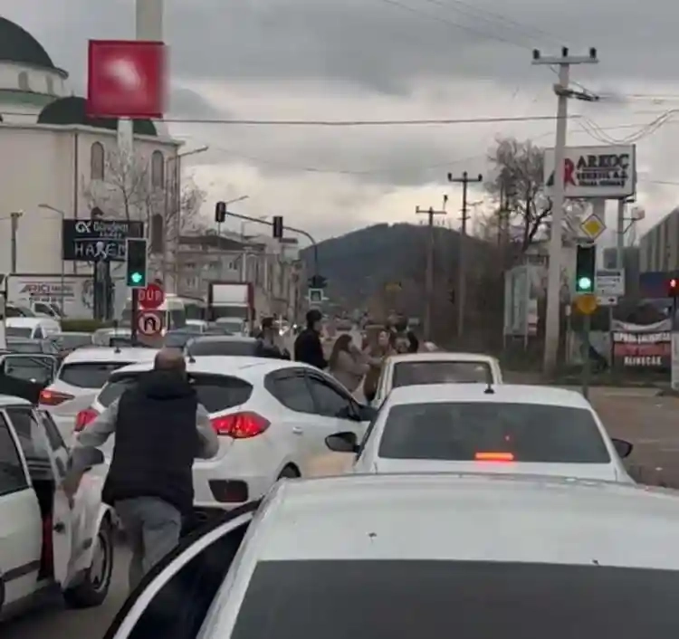 Bursa’da yol verme kavgasına tutuşan kadınlar, cadde ortasında trafiği hiçe sayarak birbirine girdi. O anlar kameraya anbean yansırken, başka bir caddede ise bu kez erkekler sopa ve yumruklarla kavga etti.