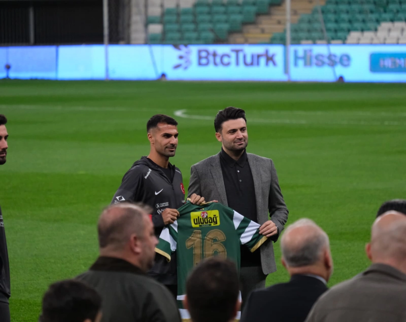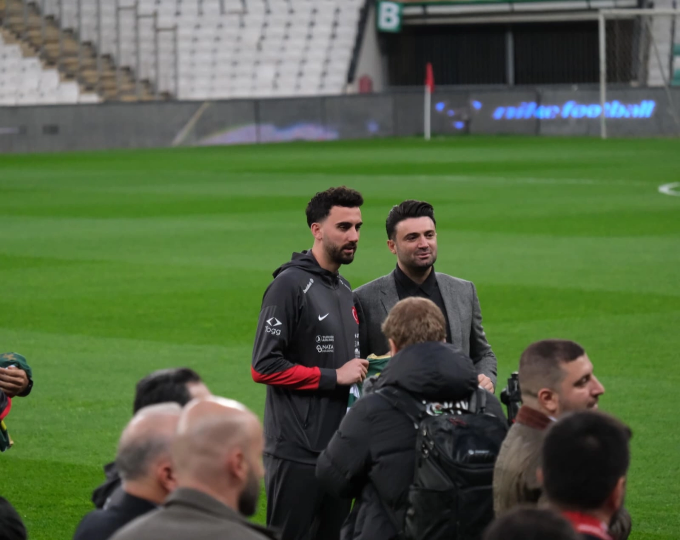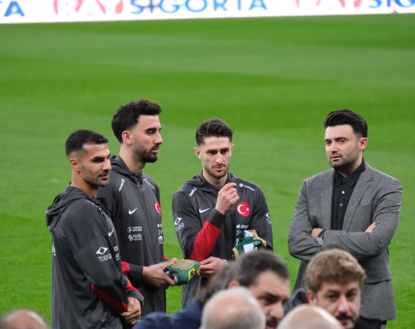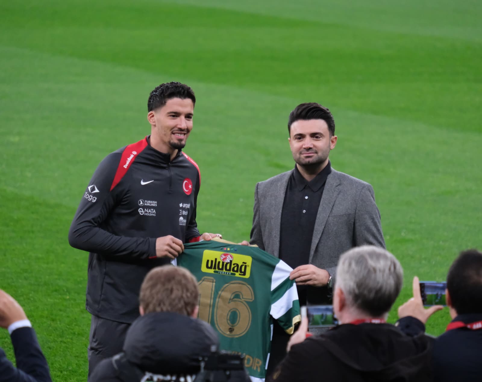 A Milli Takım stadyum çimlerinde 10 dakikalık yürüyüşü sırasında Başkan Enes Çelik tarafından memleketleri Bursa olan futbolculara üzerlerinde isimleri yazılı olan Bursaspor formaları hediye edildi.