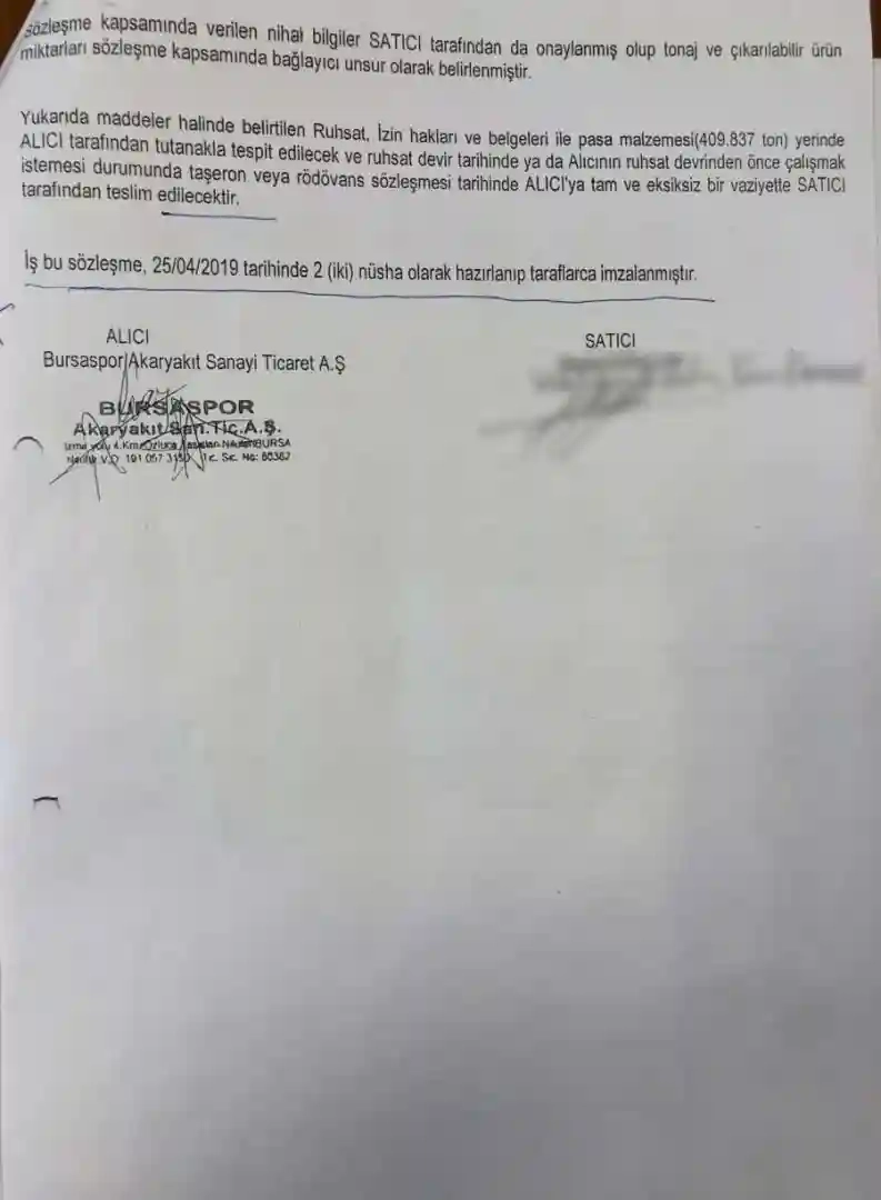 Bursa ili Nilüfer ilçesi Kuruçeşme Köyü mevkiinde yer alan 100 dönüm alanda bulunan ENERJİ TABİ KAYNAKLAR BAKANLIĞI, MADEN VE PETROL İŞLERİ GENEL MÜDÜRLÜĞÜ tarafından verilmiş 2006/10257 (a) grubu kartel işletme iznini, İşletme Ruhsatı’nın bu ruhsatta faaliyet gösterebilmesi için alınmış tüm hak ve izin belgelerinin ve de ruhsat sahasında stokta bulunan üretilmiş, pasa (409837 ton) malzemenin yine satış bedelleri alıcıda kalacak şekilde Bursaspor Akaryakıt Sanayi Ticaret A.Ş'ye satış, devir ve teslimi iş bu sözleşmenin konusunu teşkil eder. Ruhsatta faaliyet gösterebilmesi için alınmış tüm izin hak ve belgelerinin ve ruhsat sahasında stokta bulunan üretilmiş pasa (409837 ton) malzemenin (üzerinde hiçbir kısıtlayıcı hak ve şerh, rehin bulunmaksızın) toplam 8.000.000 TL + KDV bedel ile alıcıya satışı, devri ve teslimi konusunda aşağıdaki şartlar dahilinde anlaşılmıştır.