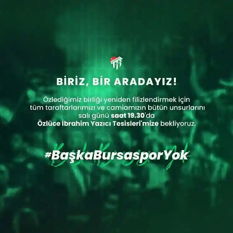 Bursaspor, birlik beraberlik mesajı ile taraftarlarını salı günü Özlüce İbrahim Yazıcı Tesisleri'ne davet etti.