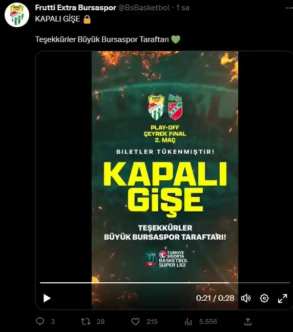 Frutti Extra Bursaspor resmi sosyal medya hesaplarından bu akşam oynanacak Pınar Karşıyaka maçının biletlerinin tükendiğini duyurdu.