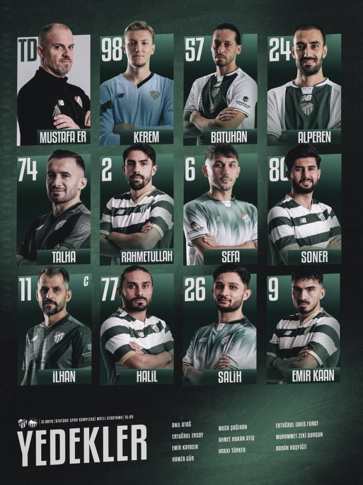 TFF 2.Lig Kırmızı Grup'da Bursaspor'un şampiyonluk yolunda kritik önem taşıyan Mardin 1969 maçı ilk 11'i belli oldu.