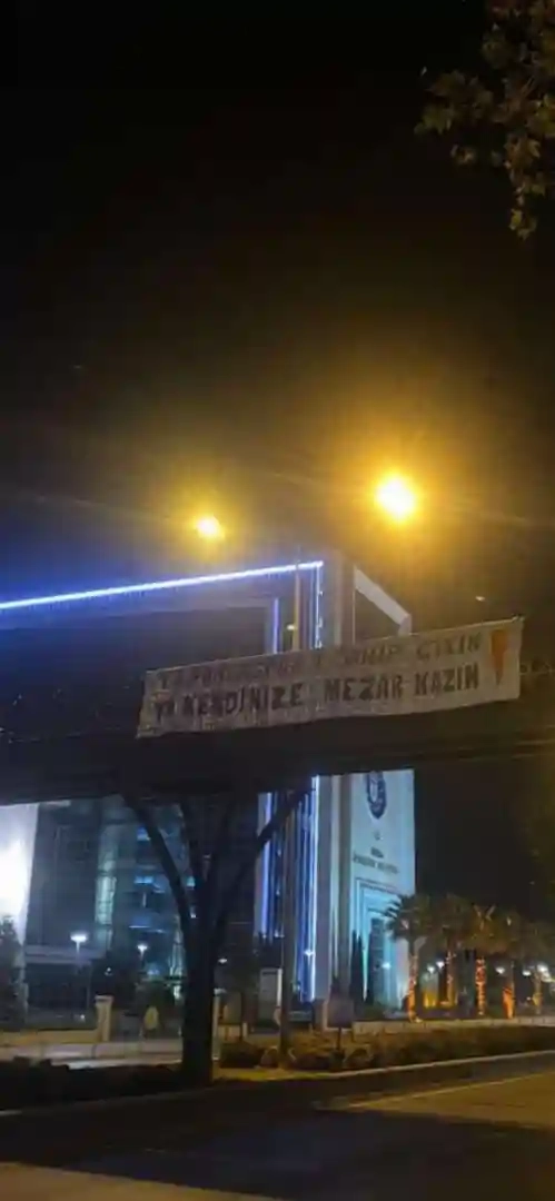 "Ya Bursaspor'a sahip çıkın ya kendinize mezar kazın" pankartıyla Demirtaş Organize Sanayi Bölge Müdürlüğü ve Bursa Büyükşehir Belediyesi Binası önünde protestolarda bulunan taraftarlar, pankartı Bursa Büyükşehir Belediyesi önündeki üst geçite astı.
