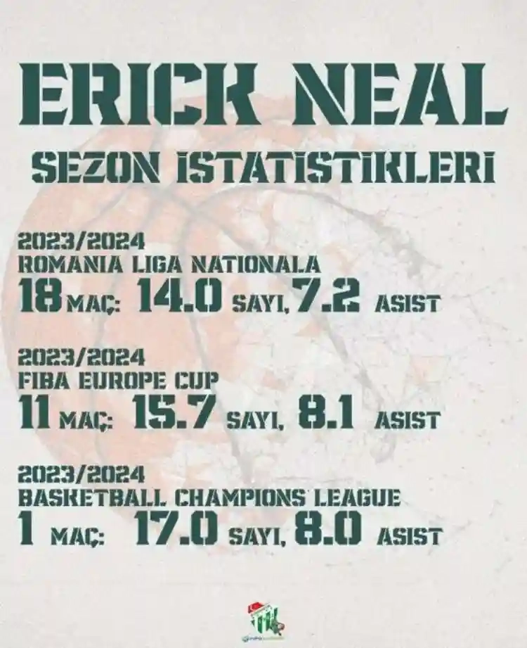 Son olarak CSM CSU Oradea forması giyen 28 yaşındaki gurad Erick Neal‘a kulübümüze hoş geldin diyor ve kariyerinde yeşil-beyazlı forma ile başarılar diliyoruz.