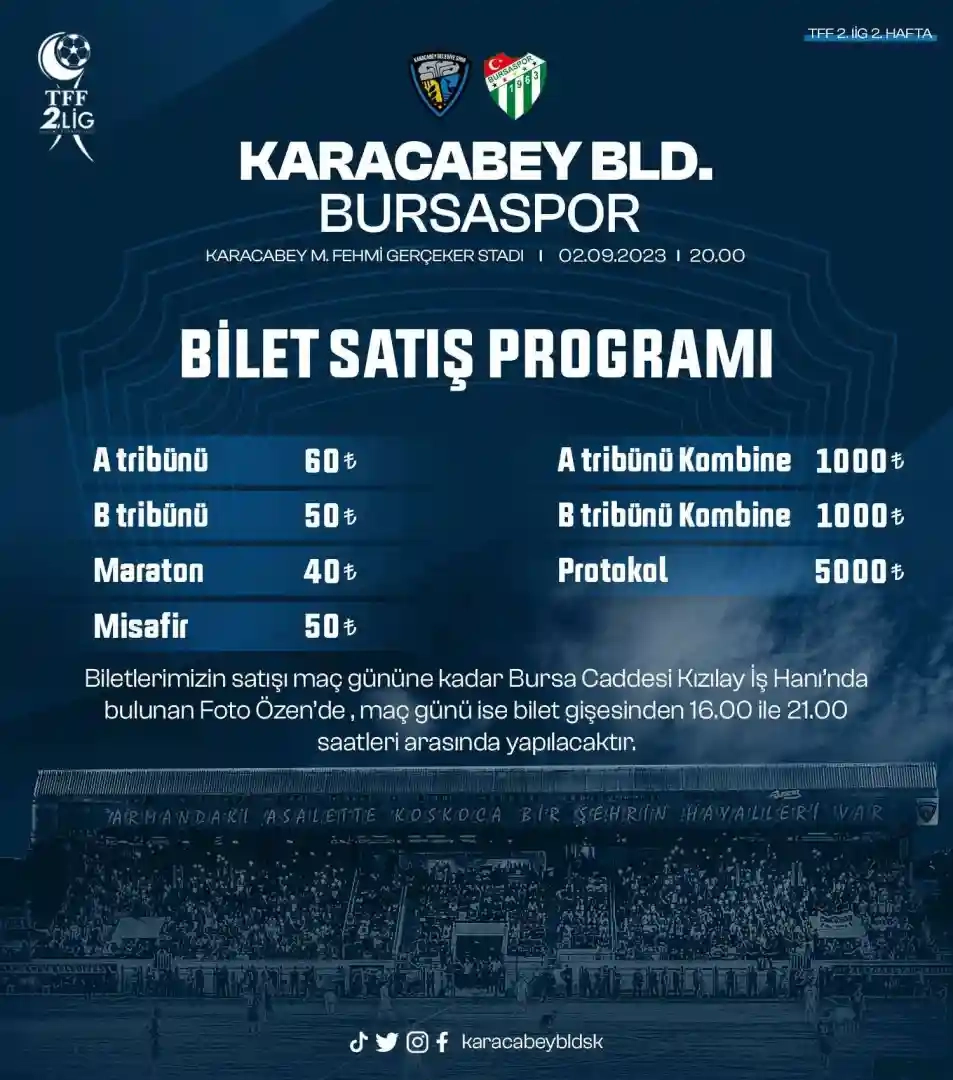 TFF 2.Lig'de ikinci hafta mücadelesinde Bursaspor ile Karacabey M. Fehmi Gerçeker Stadyumunda karşılaşacak olan Karacabey Belediyespor, bilet fiyatlarını açıkladı. Karacabey Belediyespor tarafından yapılan açıklamada bilet temini için şu açıklamaya yer verildi;