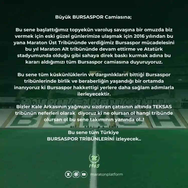 Bu sene başlattığımız topyekûn varoluş savaşına bir omuzda biz vermek için eski güzel günlerimize ulaşmak için 2016 yılından bu yana Maraton Üst Tribününde verdiğimiz Bursaspor mücadelesini bu yıl Maraton Alt tribününde devam ettirme ve Atatürk stadyumunda olduğu gibi sahaya direk baskı kurmak adına bu kararı aldığımızı tüm Bursaspor camiasına duyuruyoruz.
