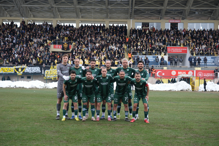 Bursaspor zorlu Muş deplasmanında, kötü zemine, taşlı, sopalı saldırılara rağmen 0-1 galibiyet ile dönmeyi başardı.