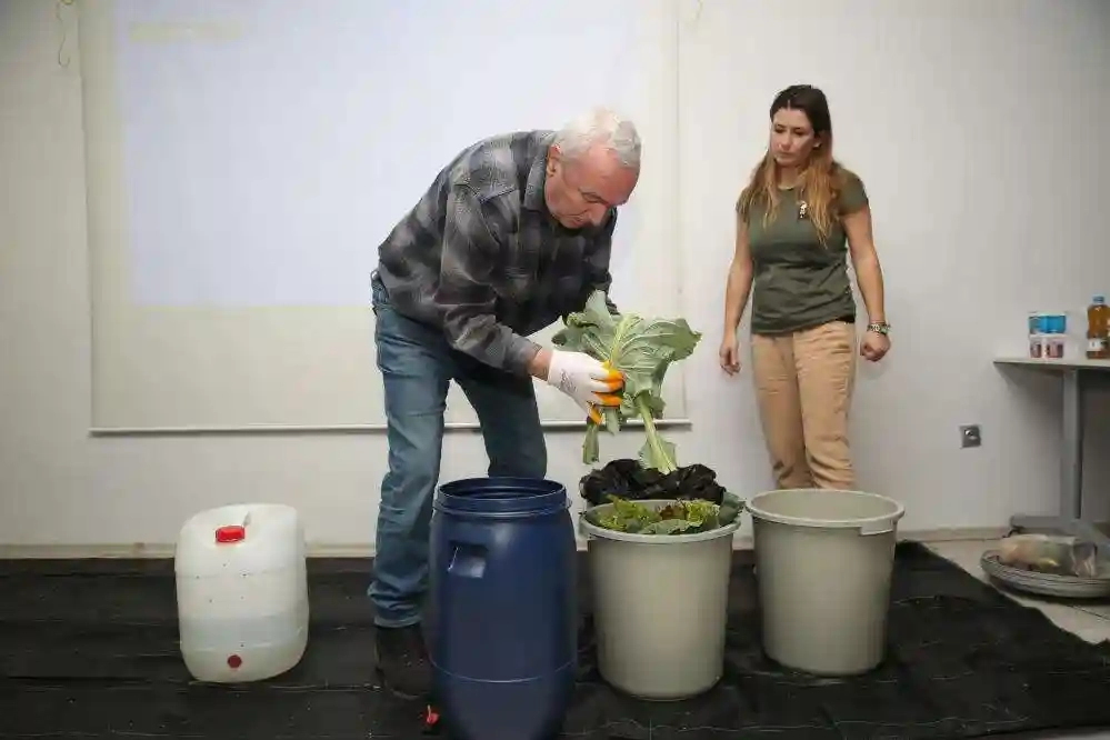 Nilüfer Belediyesi’nin düzenlediği eğitimde emekli Prof. Dr. Volkan Dündar, bokaşi kompostu ve bokaşi kovası yaptı. Dündar, bokaşi kompostunun avantajlarını ve toprak canlılığına faydalarını da katılımcılarla paylaştı.