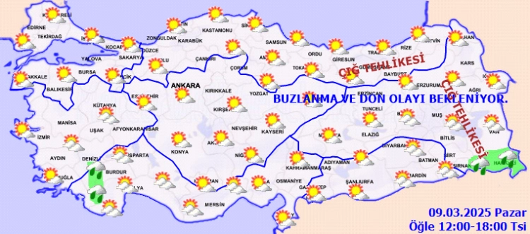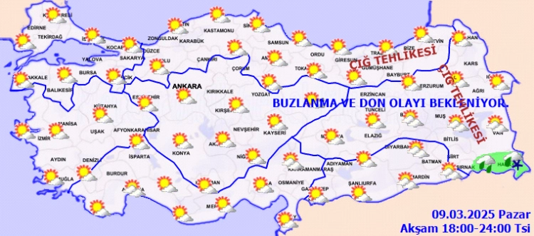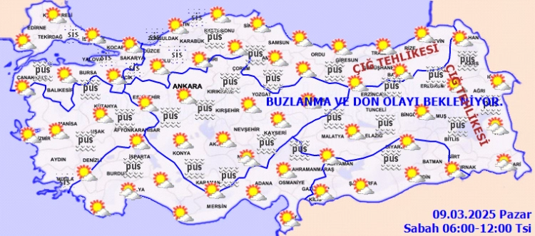 Sabah ve gece saatlerinde Doğu Anadolu'nun doğusunda buzlanma ve don, iç ve doğu kesimler ile Marmara ve Batı Karadeniz kıyılarında pus ve yer yer sis bekleniyor. Doğu Karadeniz’in iç kesimlerinin yüksekleri ile Doğu Anadolu’nun yüksek ve eğimli yamaçlarında çığ tehlikesi bulunmaktadır.