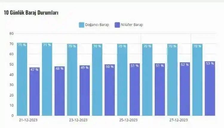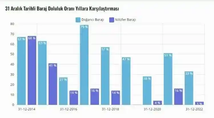 Bursa'da sıcaklıklar mevsim normallerinin üzerinde seyretse de Doğancı ve Nilüfer barajları doluluk oranı yıllar sonra en iyi seviyesine ulaştı. En son 2014 yılının 31 Aralık tarihinde iki barajın ortalama su seviyesi yüzde 67.5 olurken, geçen yıl yüzde 33 doluluk oranına sahip Doğancı Barajını besleyen Nilüfer Barajında su seviyesi yüzde 3, ortalama doluluk oranı ise 16.5'i gösteriyordu.