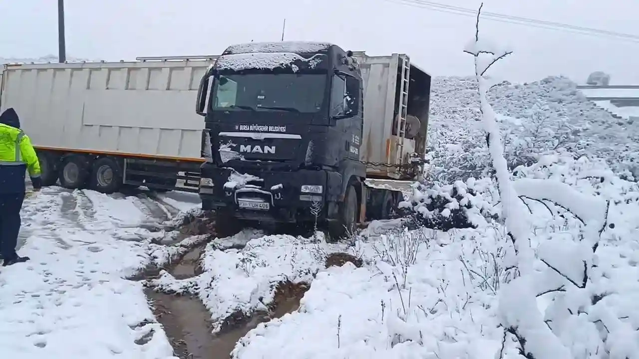 Bir süre bu şekilde kalan tırlar, Bursa Büyükşehir Belediyesi Ulaşım Daire Başkanlığı ekipleri tarafından yol temizlendikten sonra yoluna devam etti.