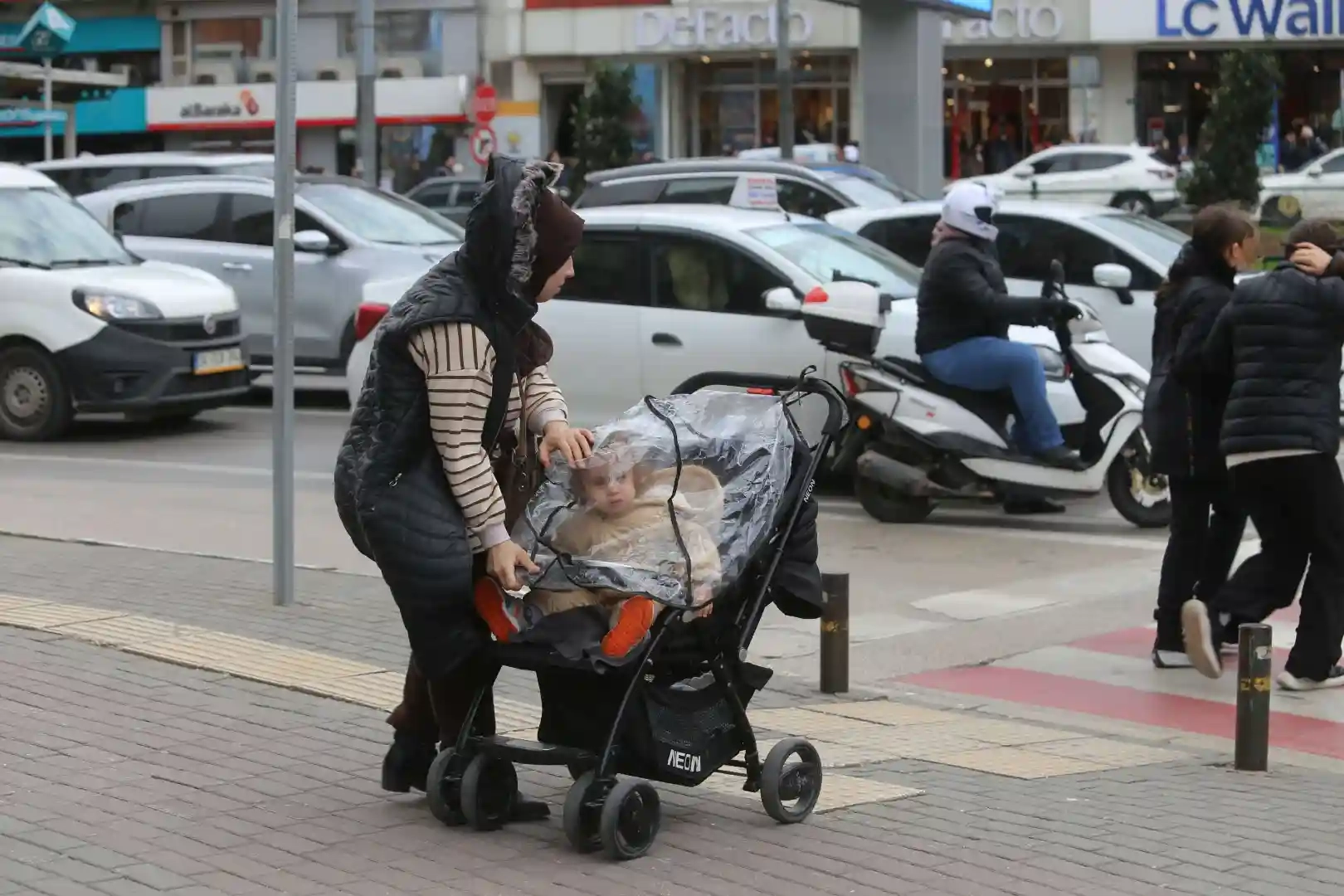 Hayatı felç eden şiddetli lodos, vatandaşlara zor anlar yaşattı. Aileler, bebeklerinin şiddetli lodostan etkilenmemesi için bebek arabalarına yağmurluk geçirirken, kimi vatandaşlar yürümekte zorluk çekti.