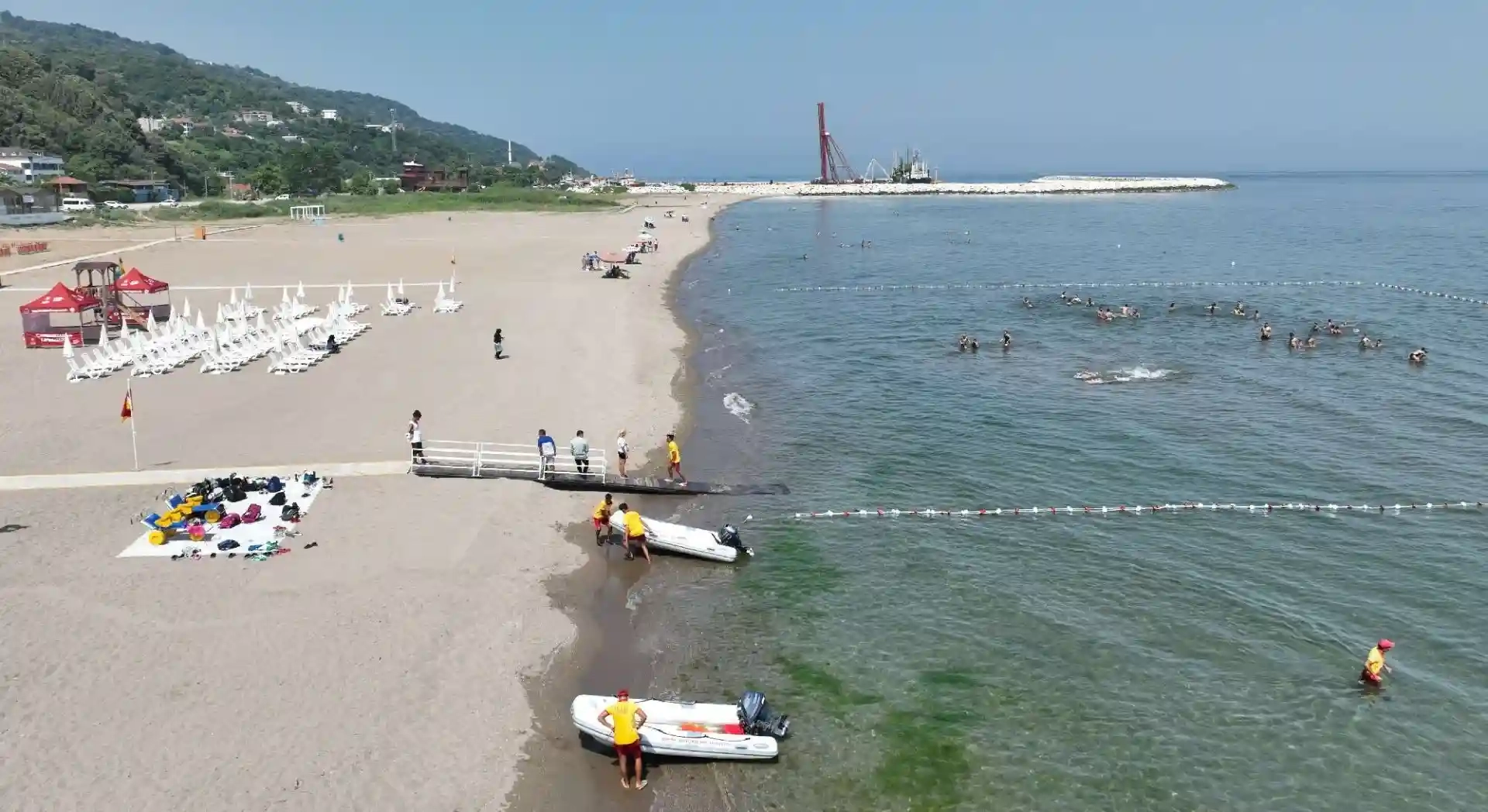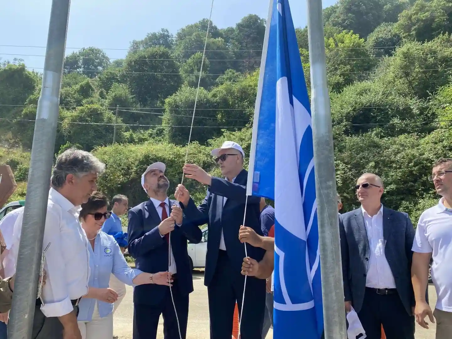 Konuşmaların ardından denizden tekne ile getirilen mavi bayrak alkışlar eşliğinde göndere çekildi.